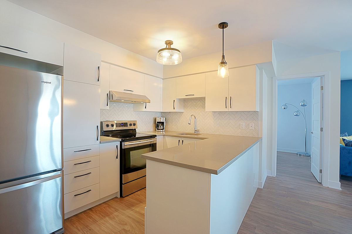Spacieuse et pratique, la cuisine se démarque par ses grands comptoirs de quartz, ses nombreuses armoires et son chic dosseret de céramique. Elle offre l’espace nécessaire pour concocter vos plats préférés et accueillir vos invités avec convivialité.