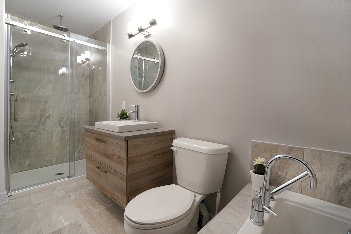 Alliant la modernité et le confort, la salle de bain témoigne du souci du détail des constructeurs d’expérience. Leur grande vanité avec rangement assure une fonctionnalité remarquable. Munie d’une douche vitrée à effet de pluie, d’un bain sur podium et d’une robinetterie de style zen, toute la pièce appelle à la détente.